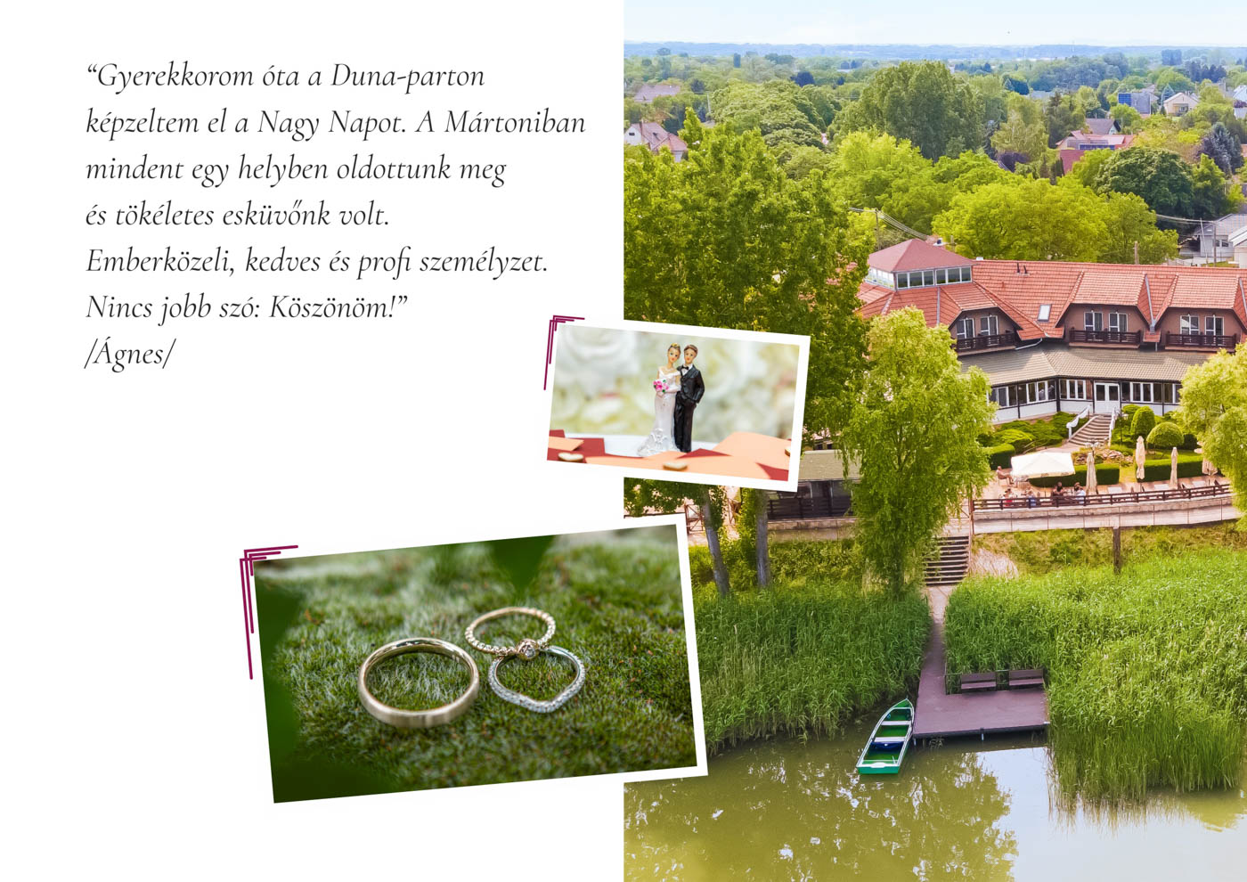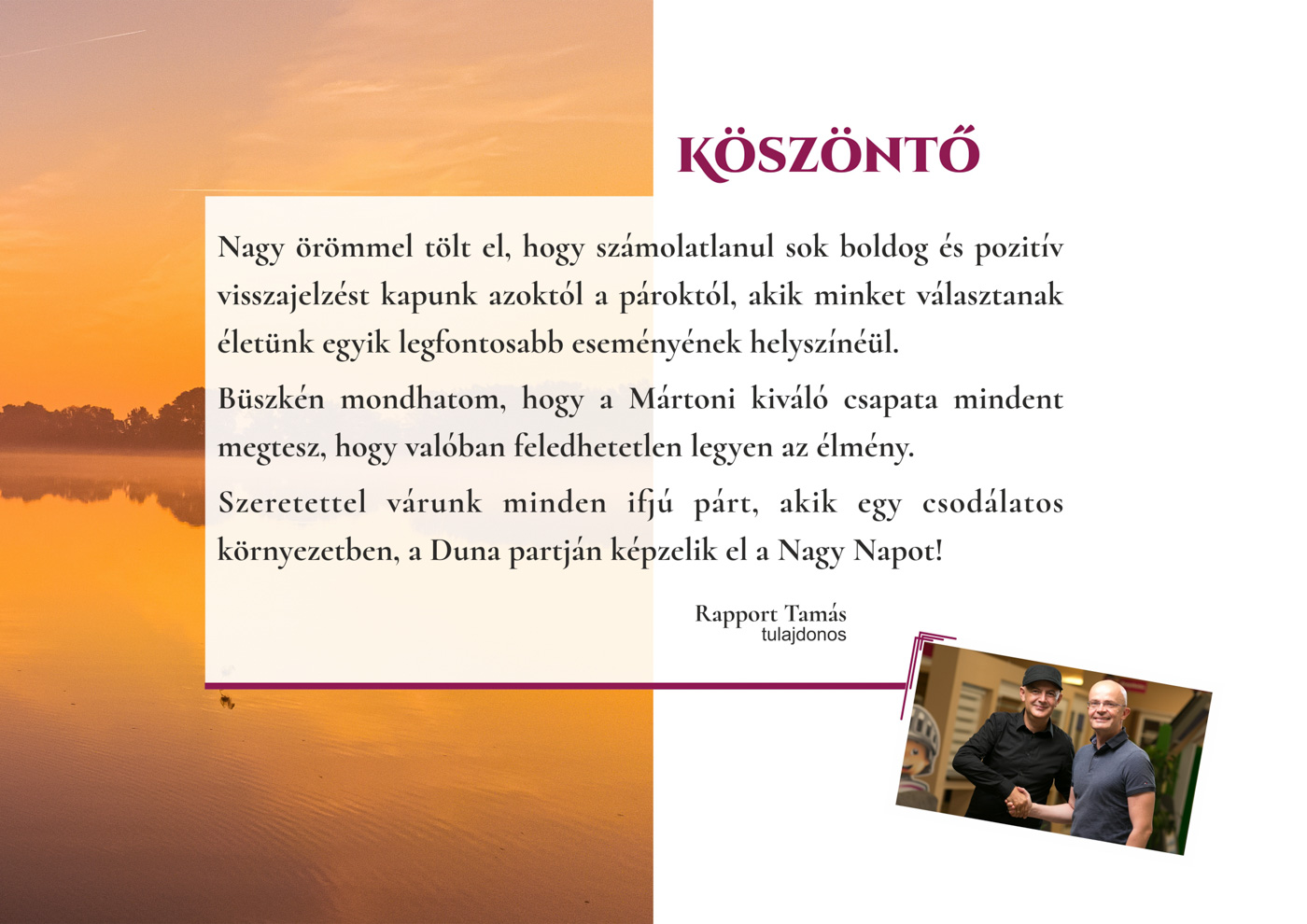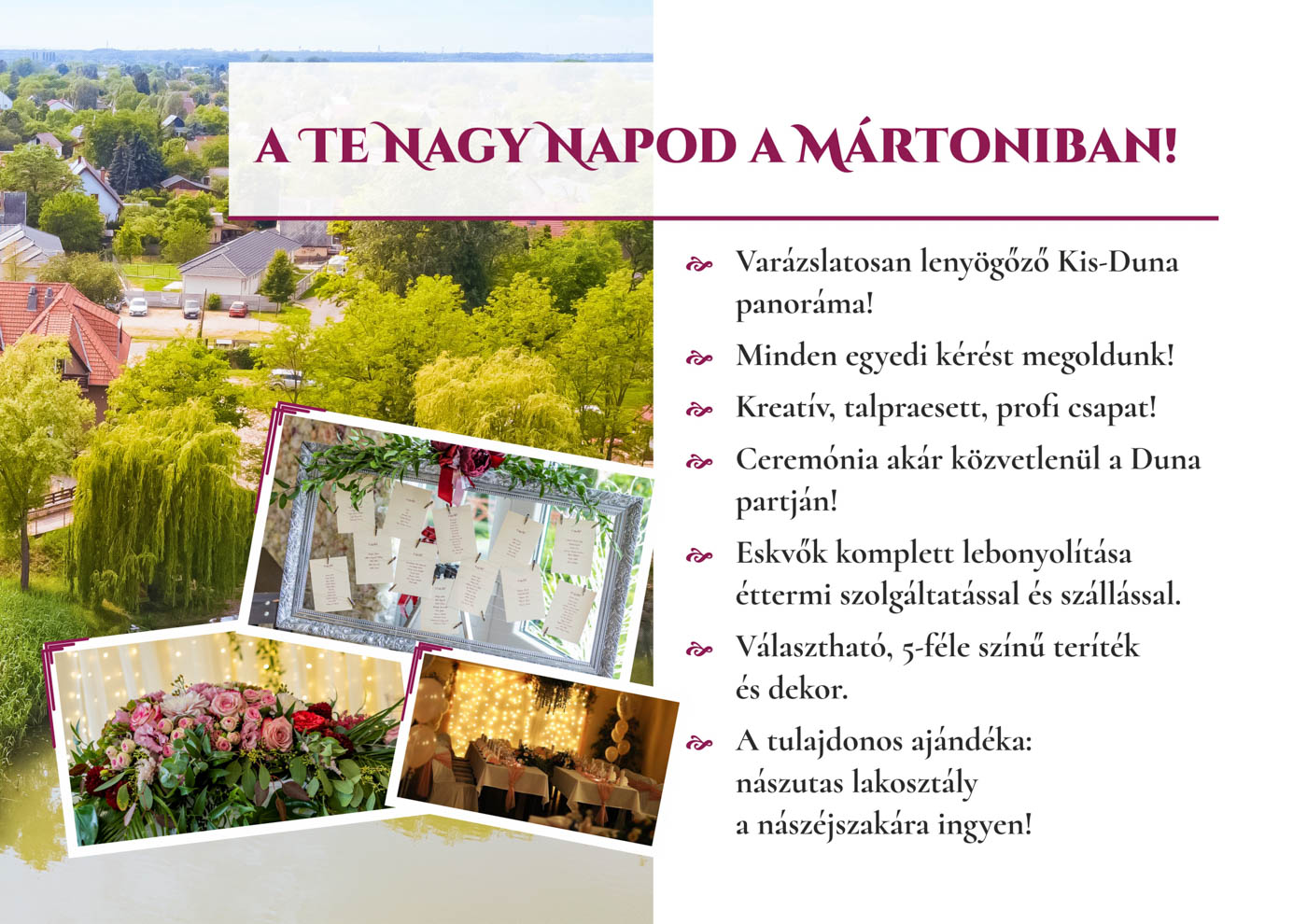 Életetek egyik legszebb napjára készültök és mi a Mártoni Csárdában azon dolgozunk, hogy ez a nap valóban felejthetetlen legyen. Meghitt hangulat, ízletes fogások és idilli környezet várja mindazokat, akik nálunk mondják ki a boldogító igent. Mi minden részletre odafigyelünk – Nektek pedig csak az ünneplés öröme marad.